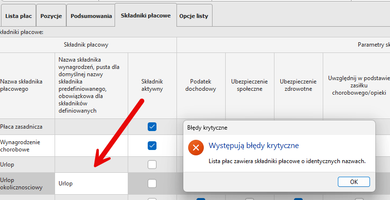 • w listach płac dodano sprawdzanie unikalności nazw składników płacowych i potrąceń, powtórzenia mogły prowadzić do problemów z wydrukiem listy,