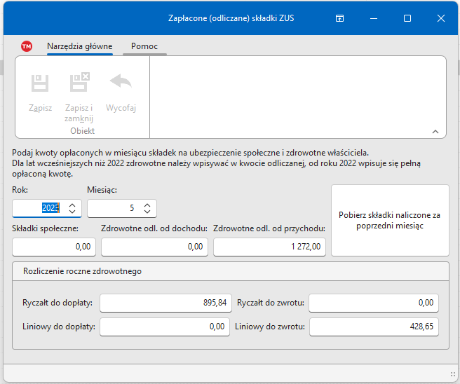 • okno edycji opłaconych składek ZUS i ich lista zostały uzupełnione o kwoty dopłat i zwrotów składek w ramach kwietniowego rozliczenia rocznego, dopłaty wykazane w tym miejscu są automatycznie odliczane od dochodu lub przychodu przy wyliczaniu zaliczek za maj, ale kwoty te nie są automatycznie uwzględniane w zeznaniach rocznych PIT-36L i PIT-28,