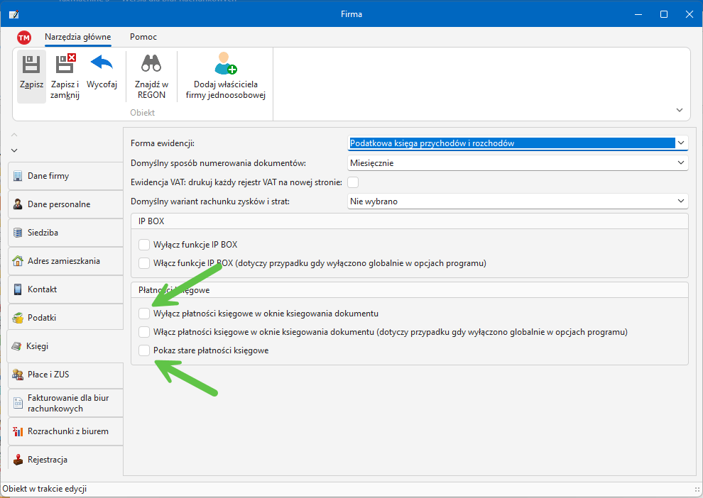 lub na poziomie firmy, jest tutaj też pole włączające nowe płatności w tym podmiocie w przypadku ich wyłączenia w opcjach programu: