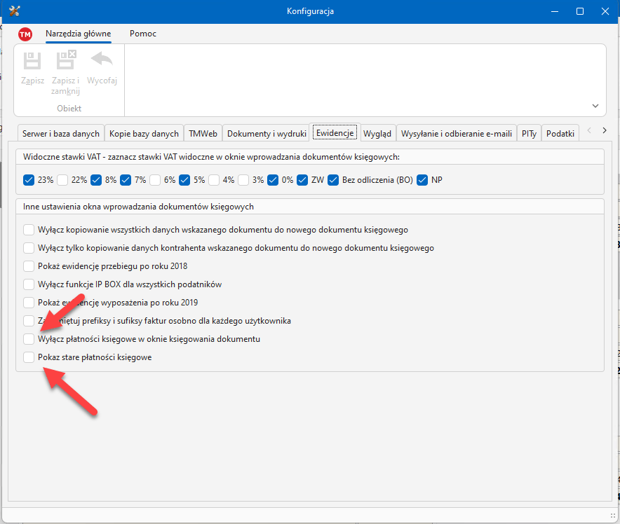 Nowy system płatności księgowych całkowicie zastępuje poprzednie opcje w oknie księgowania. Istnieją jednak opcje, które pozwalają na wyłączenie nowego systemu i przywrócenie starych elementów. Można to zrobić poziomie konfiguracji programu: