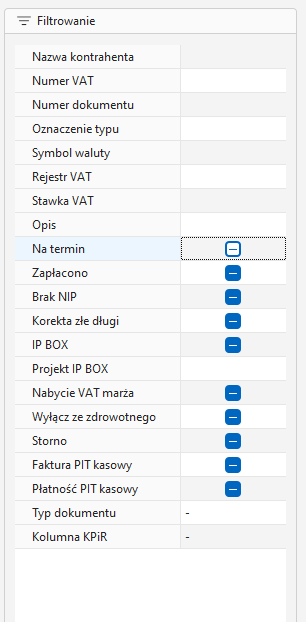 Innym przydatnym elementem są opcje filtrowania dla dokumentów księgowych, w tym po statusie "Faktura PIT kasowy" i "Płatność PIT kasowy", ta druga opcja dotyczy automatycznie ksiegowanych płatności w trybie PIT kasowego.