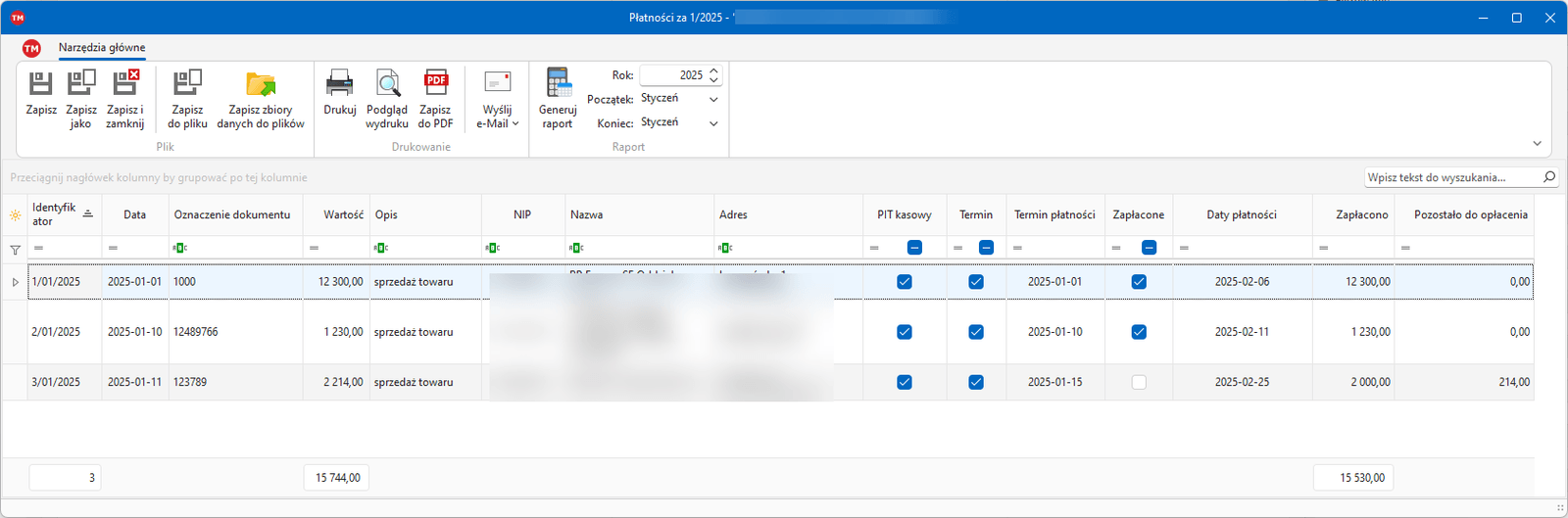 Uzupełnieniem nowego systemu jest nowy ulepszony raport "Płatności", w którym pokazany jest status płatności dla dokumentów zaksiegowanych w podanym okresie, widać też tutaj status "PIT kasowy".